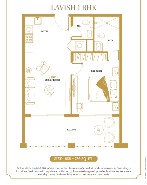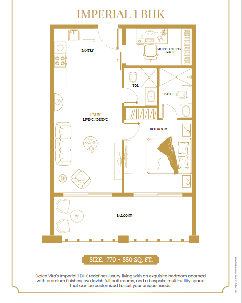 Das Imperial 1 BHK von Dolce Vita definiert luxuriöses Wohnen neu mit einem exquisiten Schlafzimmer mit erstklassiger Ausstattung, zwei großzügigen Badezimmern und einem maßgeschneiderten Mehrzweckraum, der an Ihre individuellen Bedürfnisse angepasst werden kann.